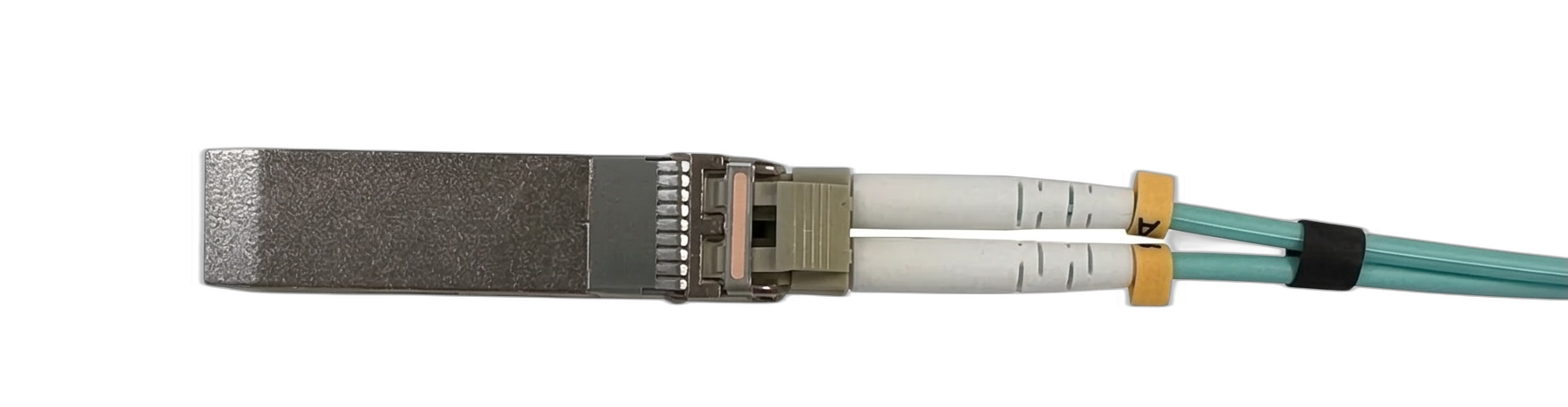 | The 10G fibre with connectors plugged into the transceiver. | ![]() |