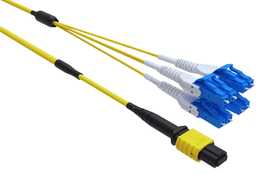 | QSFP transceiver. | A cable compatible with a multi fibre push on on one end and eight LC connectors on the other. |